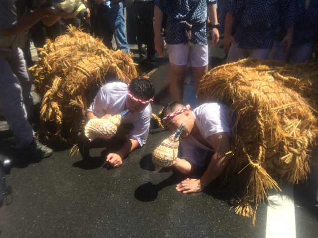 ワラで巻かれ、ホラ貝を吹き濡らされながら町内を30分担ぎ回されるお祭りで、降り続く雨が止むように祈願したことが起源と言われています。