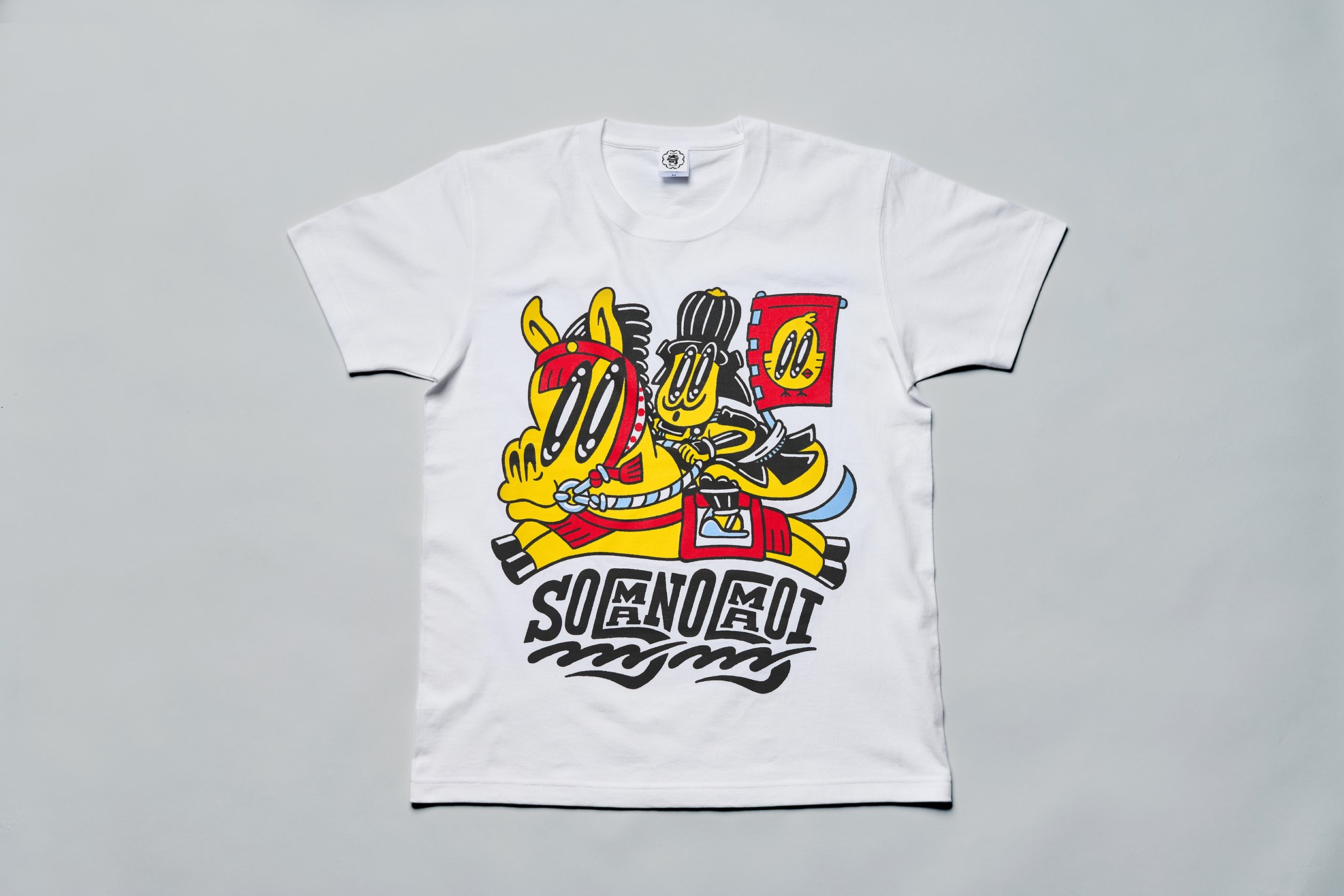 第一弾は、数百騎の騎馬がひしめく神旗争奪戦や甲冑競馬など、戦国絵巻さながらの光景をみることができる福島県相双地方の祭り「相馬野馬追(そうまのまおい)」と、クセのあるキャラクターたちによって繰り広げられる独特の世界観で、中毒性の高い作品を世に送り出し続けるクリエイティブユニット「AC部」がコラボレーション。本祭りをテーマにしたTシャツ(税込5,500円)を制作し、本日より販売を開始いたします。