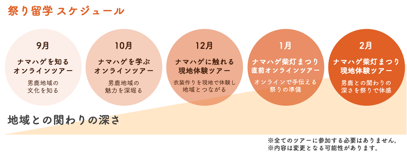 東日本大震災から10年目の節目となる本年は、一般社団法人男鹿市観光協会DMO推進室(代表:武内信彦、以下男鹿市観光協会)と連携し、ユネスコ無形文化遺産にも登録された来訪神行事「男鹿のナマハゲ」や、毎年2月に開催される「なまはげ柴灯(せど)まつり」をテーマといたしました。地域側で実施されている既存のコンテンツに加え、新たにオリジナルコンテンツを組み込み、オフラインとオンラインの体験を掛け合わせた一連の体験プログラムを『祭り留学』として提供いたします。