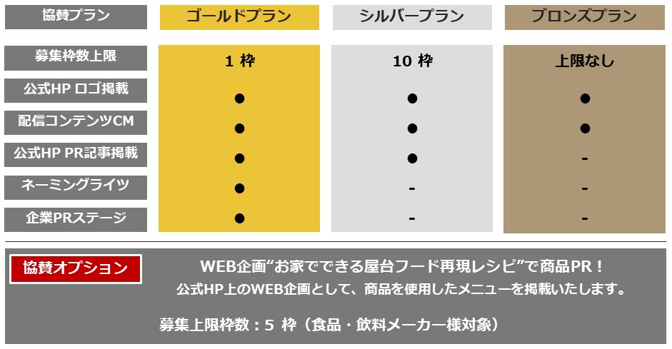 協賛メニューについては下記の通りとなります。※一口100,000円~ 詳細についてはお問合せ下さい。
