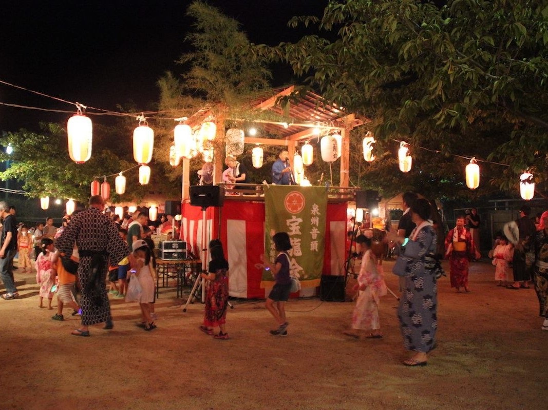 日本三大音頭の一つに数えられる「泉州音頭」は、南大阪「泉州」の地で受け継がれる盆踊りです。櫓に上がった音頭取りによる生歌と、生演奏に合わせて踊るのが特徴。テンポがゆったりした優雅なものから、テンポの早いものまでバラエティに富んでいます。