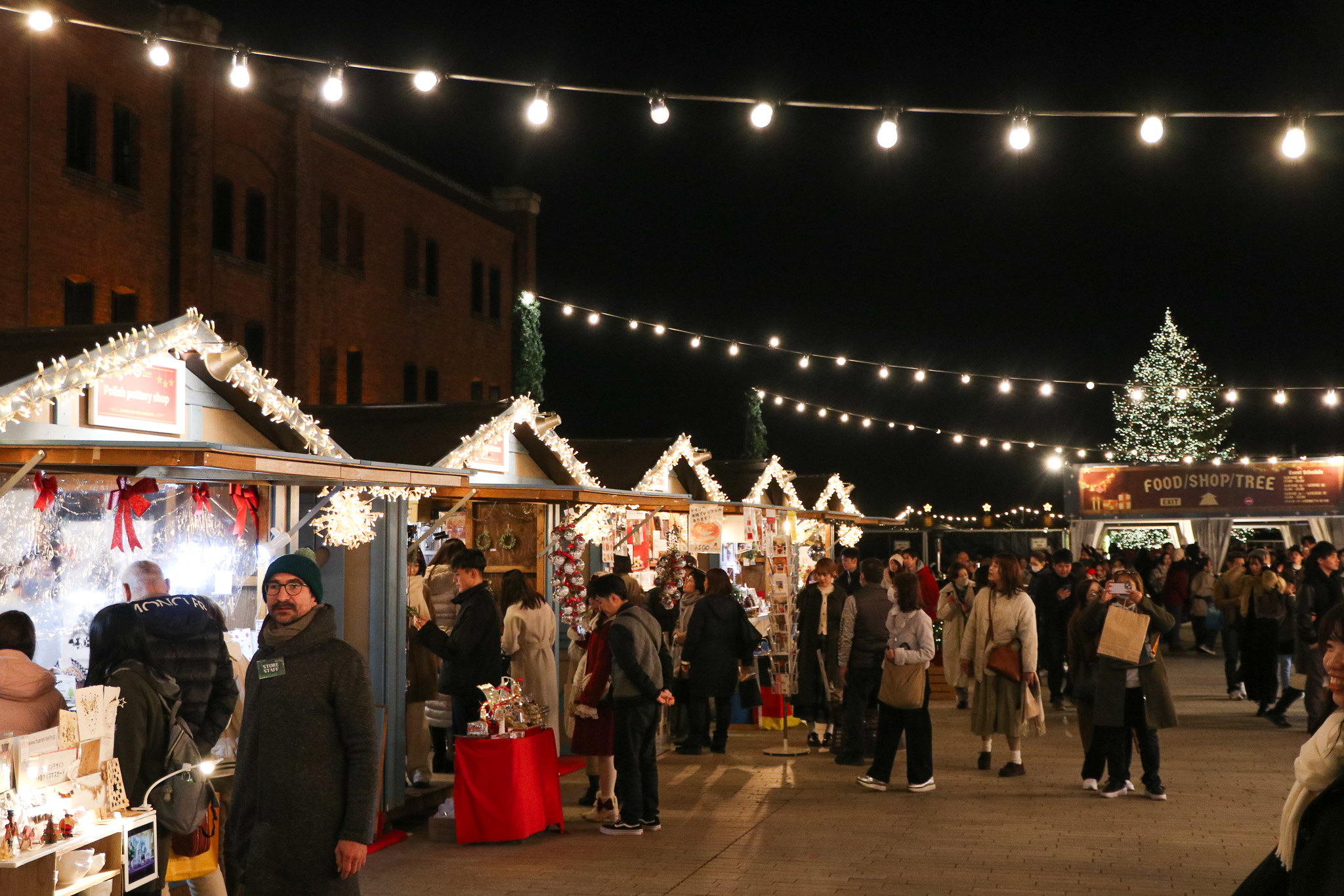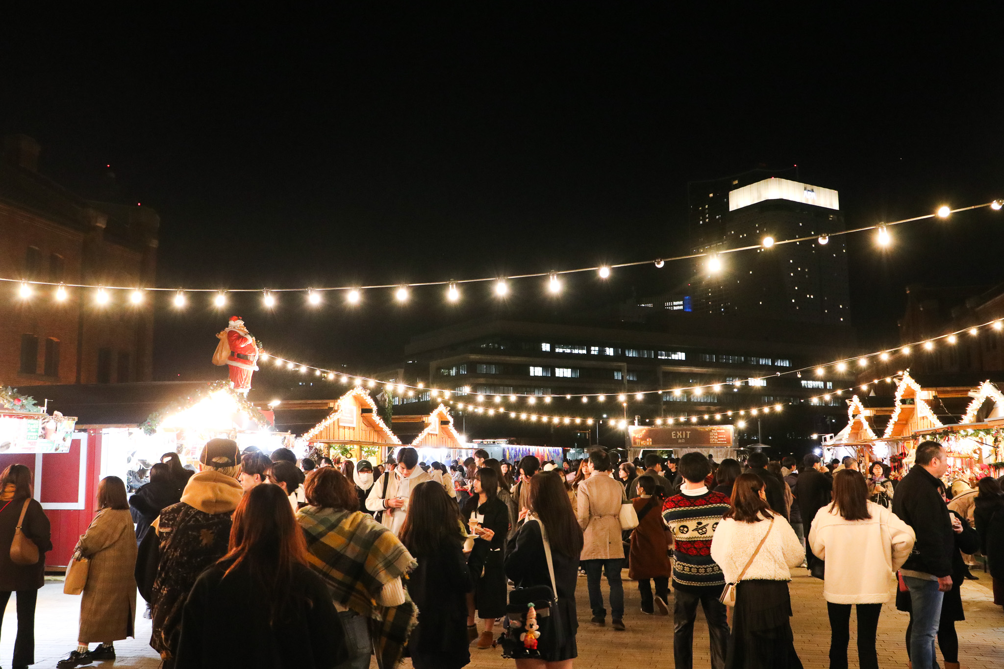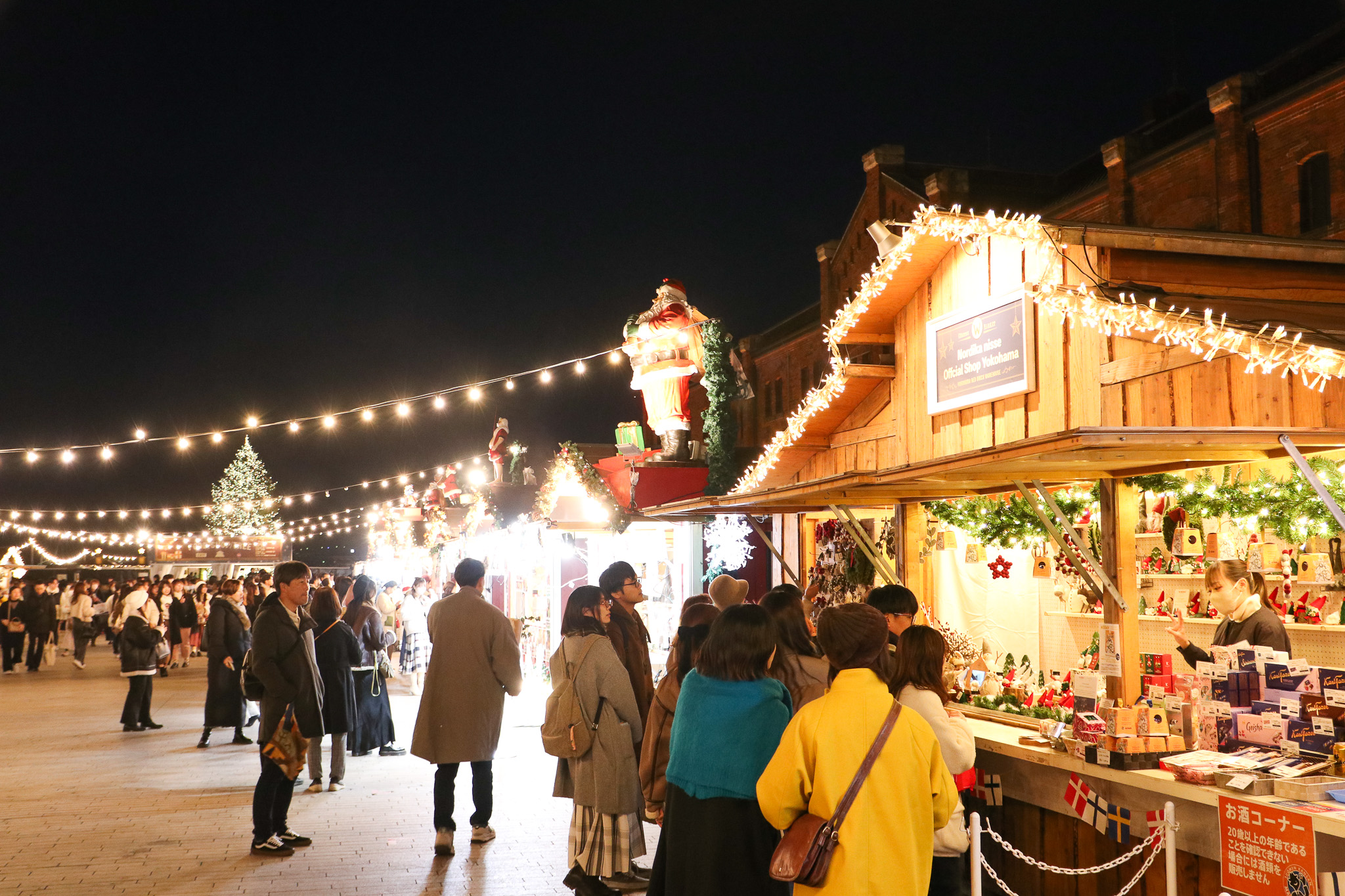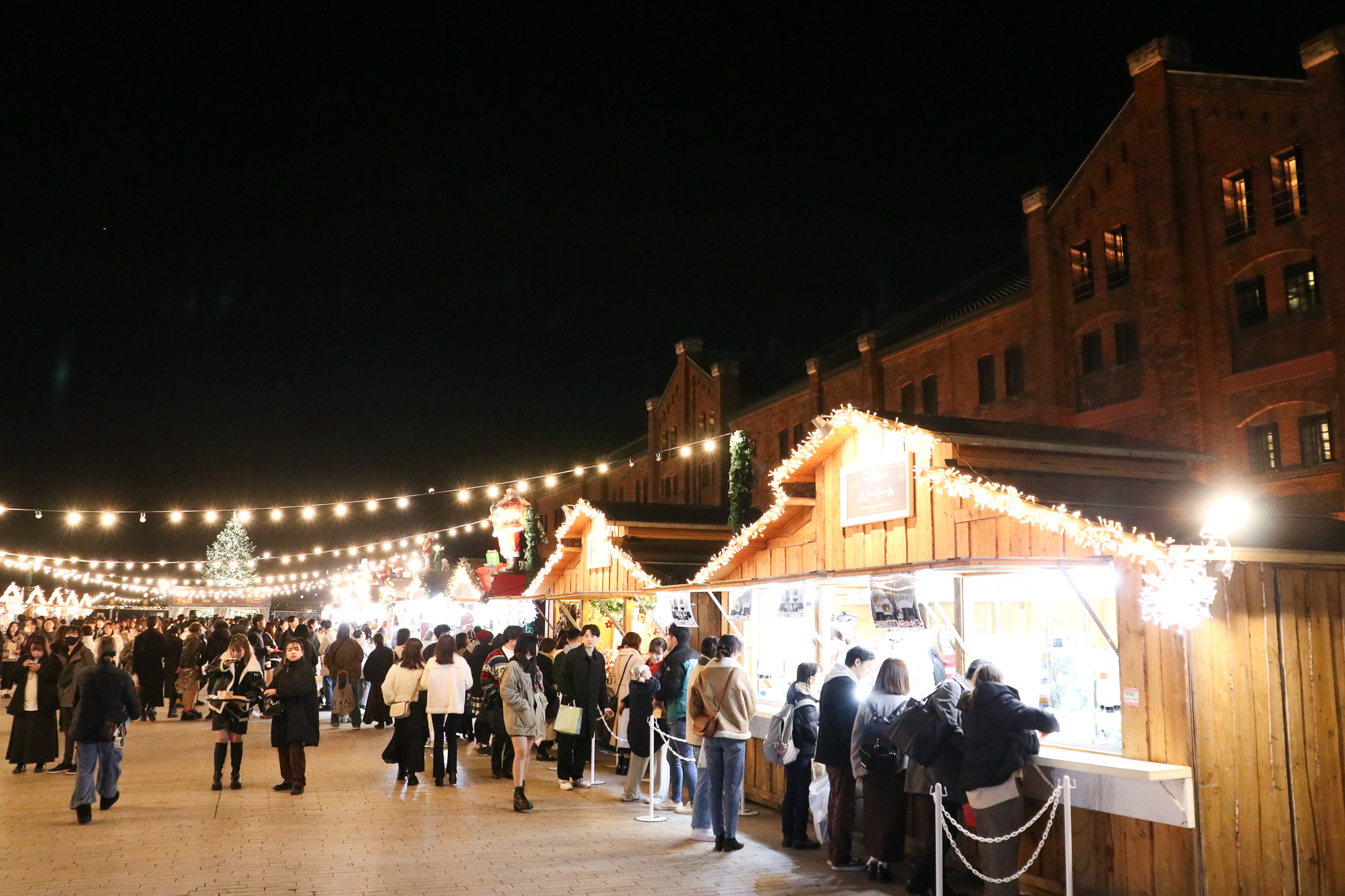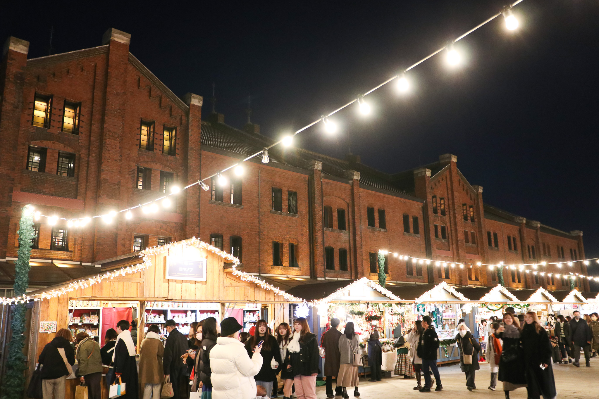 横浜赤レンガ倉庫の周りにクリスマスマーケットが広がる。