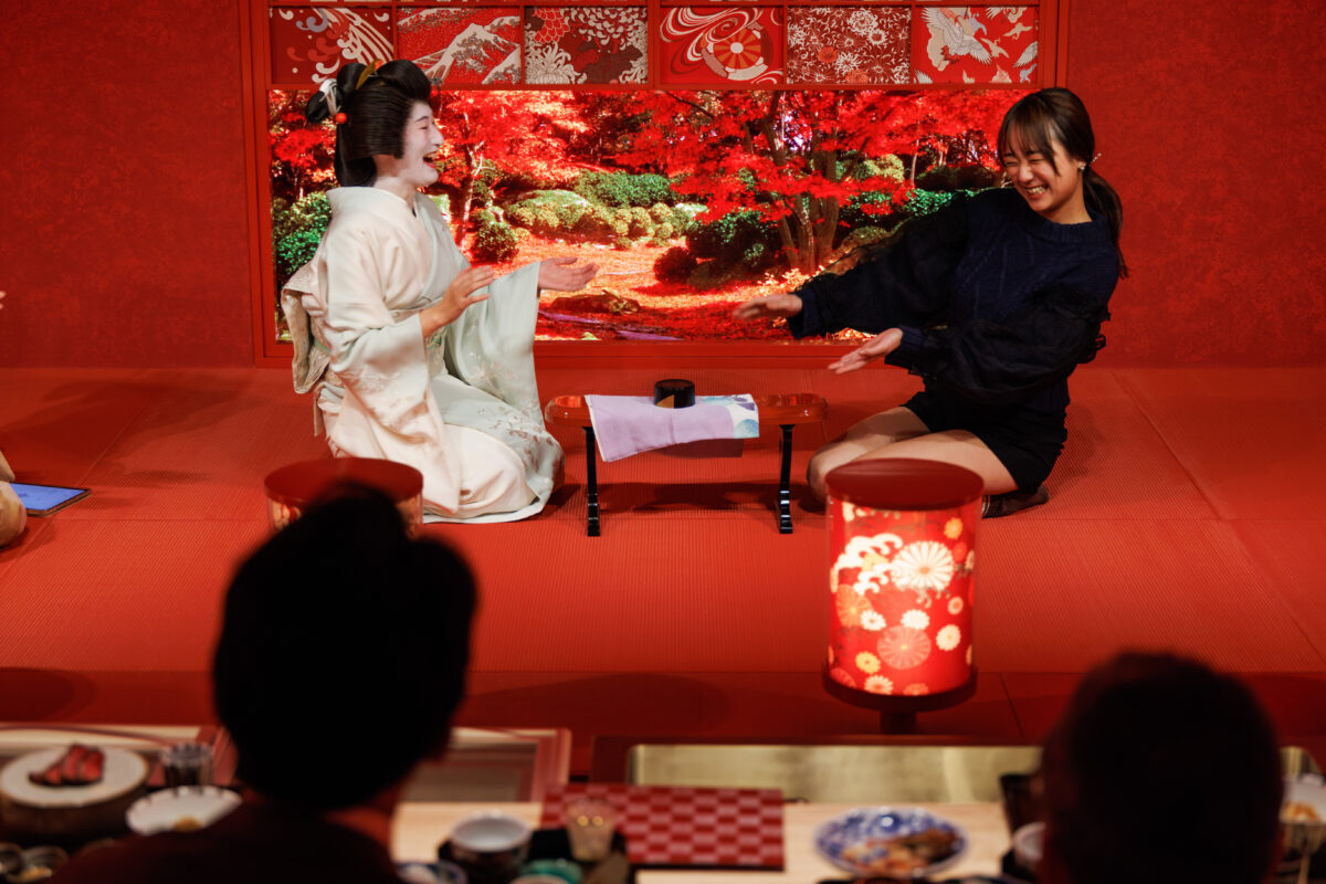 紅艶はグランハマー6階に位置する、訪日観光客に特化した特別な空間です。プロの芸者が織りなす伝統芸能パフォーマンスやお座敷遊びが楽しめ、さらに一流料亭監修の高級会席料理が提供されます。和室でリラックスしながら、古き良き日本文化を五感で堪能できます。