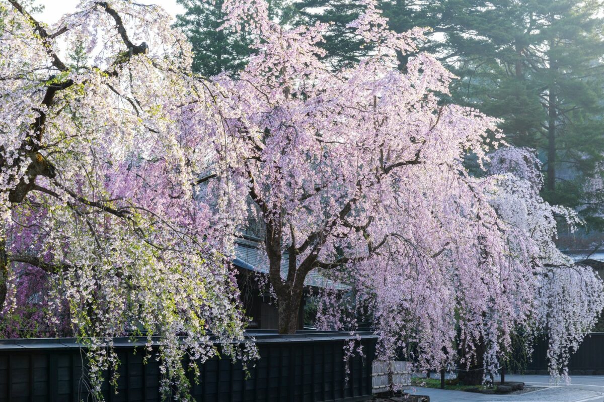 角館町内には、国の天然記念物に指定されているものを含め約400本のシダレザクラがあります。なかでも武家屋敷通りのでは黒板塀に映え、息をのむほどの美しさです。武家屋敷通りの西側では、国の名勝に指定されている桧木内川堤のソメイヨシノが約2kmにわたってトンネルをつくり、古城山頂上から見る、角館全体が薄紅色に染まる光景も圧巻です。