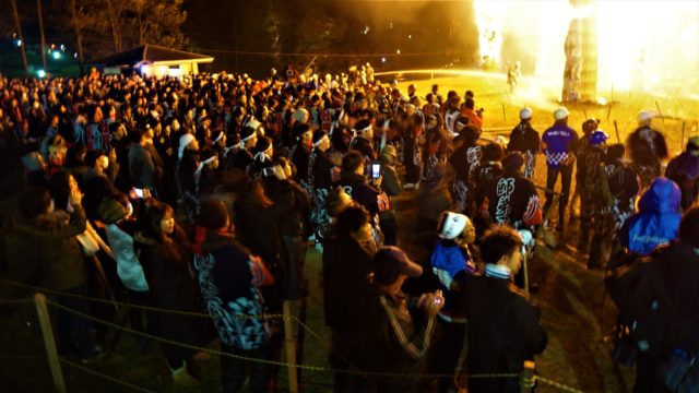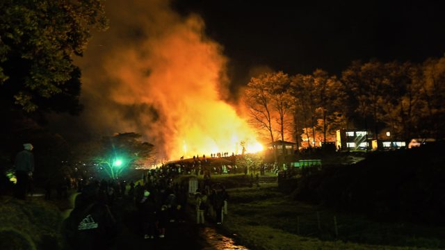 火を灯された巨大な30本の松明は、秋の夜空が昼のように明るくなるほど燃え盛り息をのむ程の大迫力です。