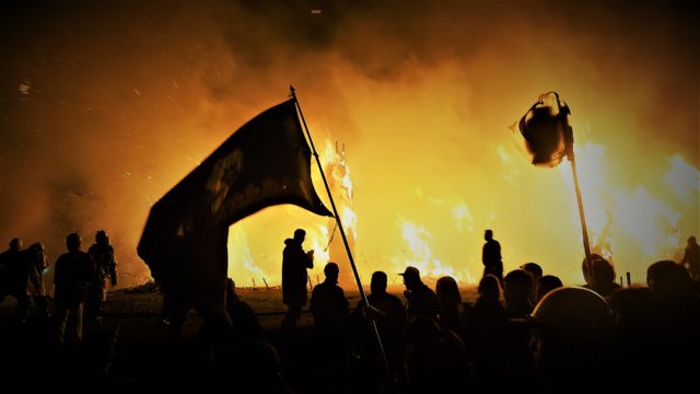 燃え盛る炎をバックに団旗がたなびく異風景はまさにマッド・マックス!