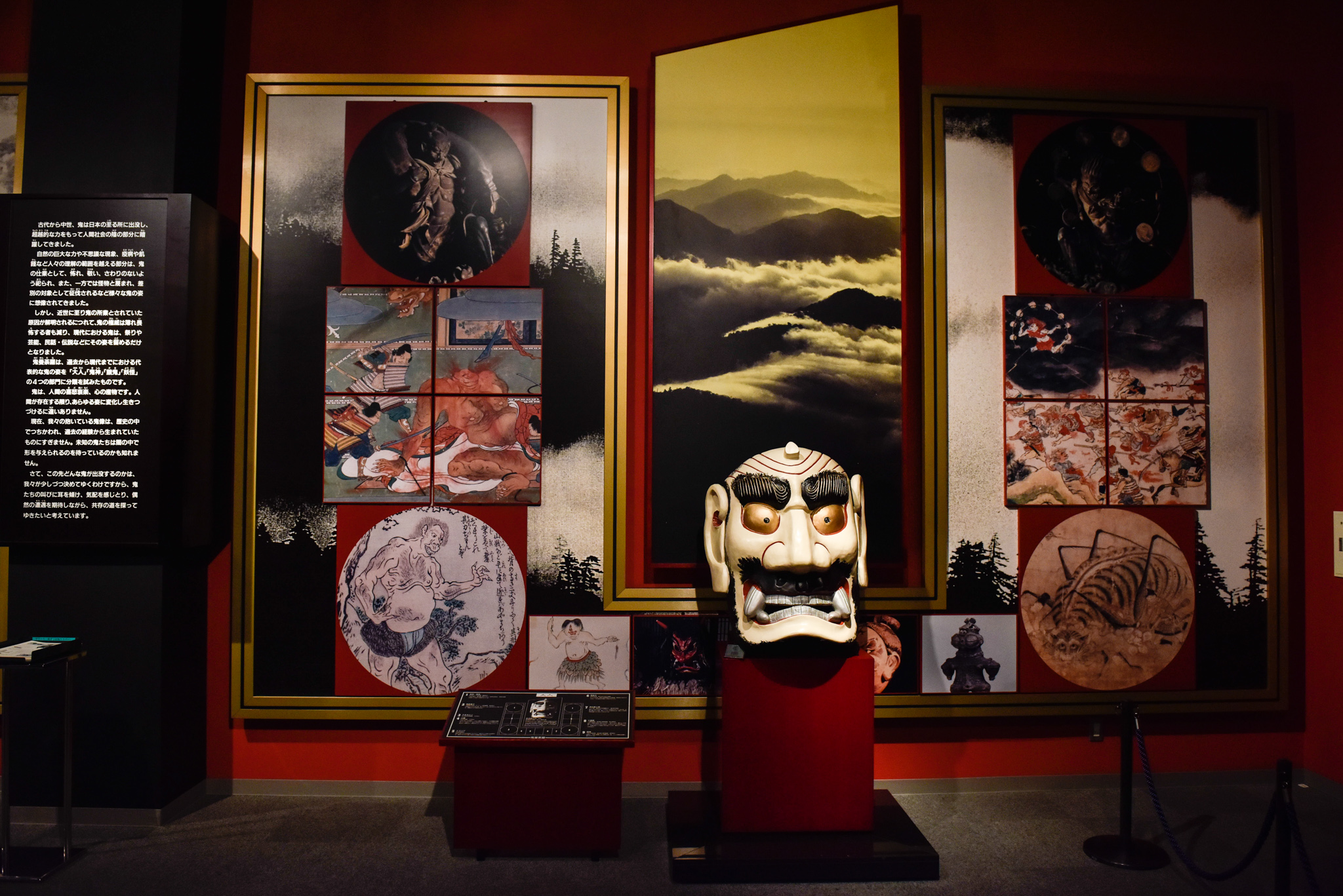 暗い空間を抜けると、鬼面、絵画、写真など様々なビジュアルが飛び込んでくる。これは全部、鬼にまつわる展示だ。例えば、中央の眉毛が太くて目の大きい鬼は鹿児島の「弥五郎どん」という名前の鬼である。秋祭りには4.85mの大人形として登場するそうだ。このような鬼が出てきたら想像するだけで恐ろしい。ここでは、ビジュアルだけでなく、看板や柱などに展示解説が書かれているので、読んでみるとさらに理解が深まるだろう。