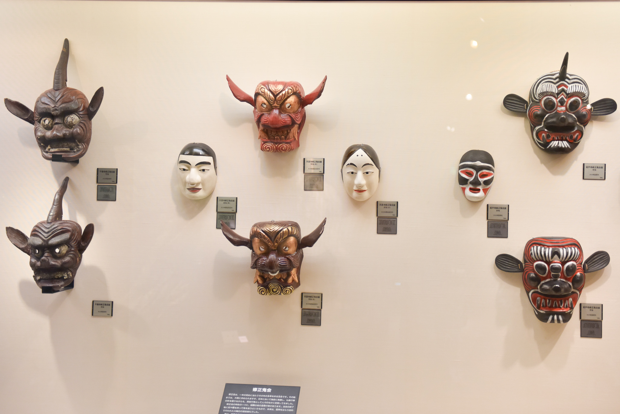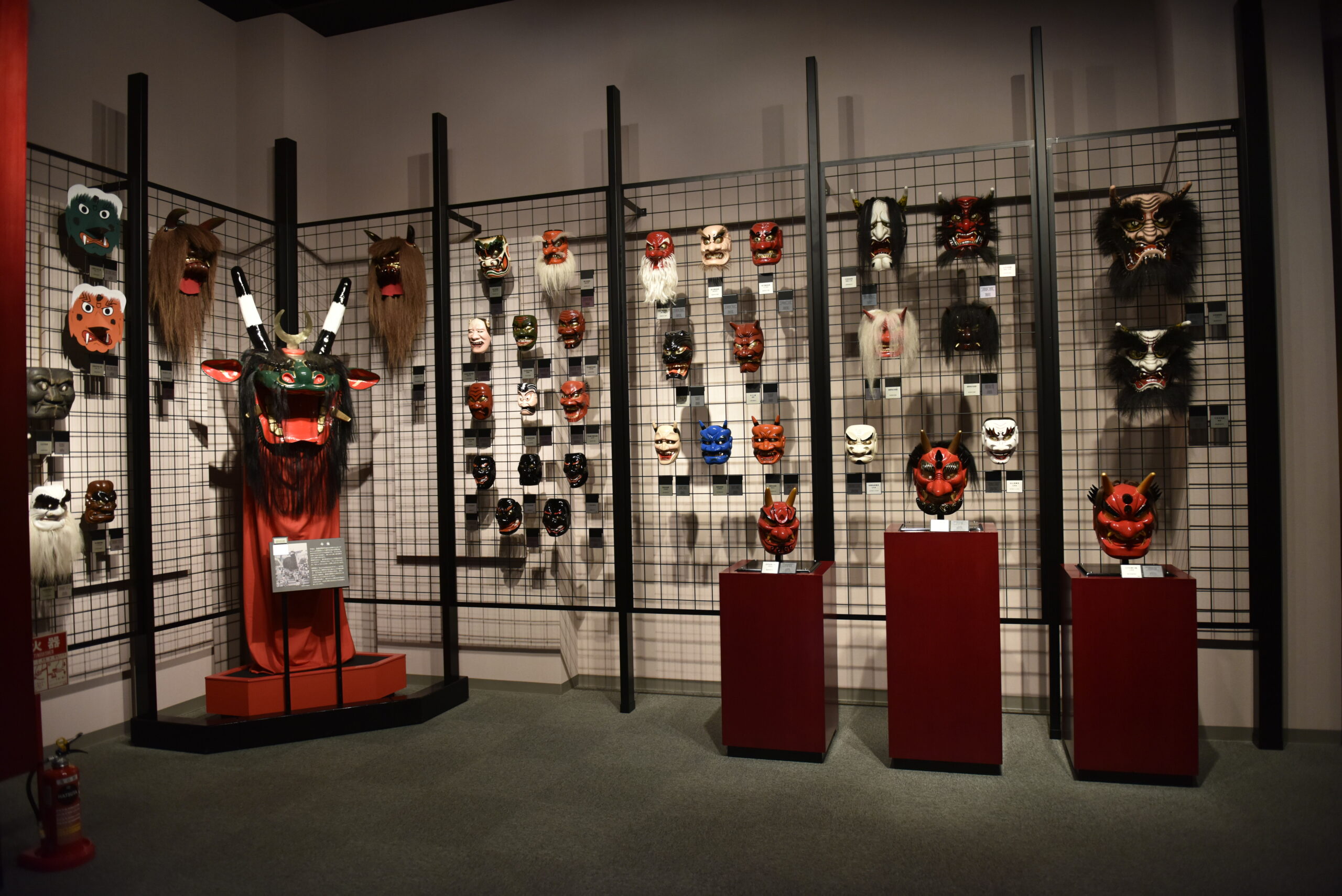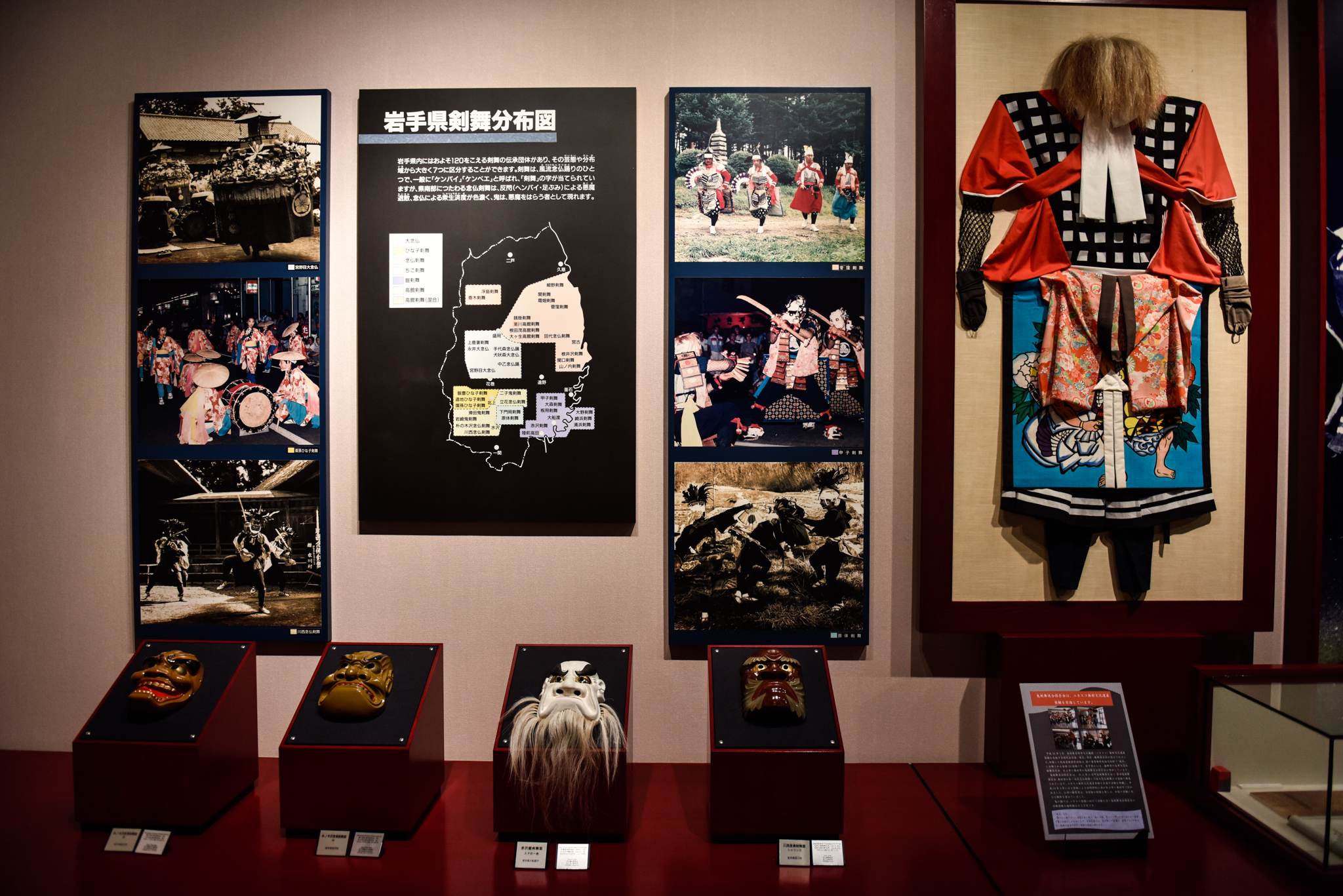こちらがはじめの方でご紹介した岩手県の鬼剣舞の展示。ここでは、いかめしい鬼のような表情の面をつけた仏の化身が登場する。北上市周辺の鬼剣舞は鬼の館にも近い岩崎地区が源流とも言われており、鬼の館の野外広場にて演舞を行う団体もあるようだ。ぜひ、鬼の館のホームページを確認するか電話などで問い合わせてから、訪れてみるのも良いだろう。