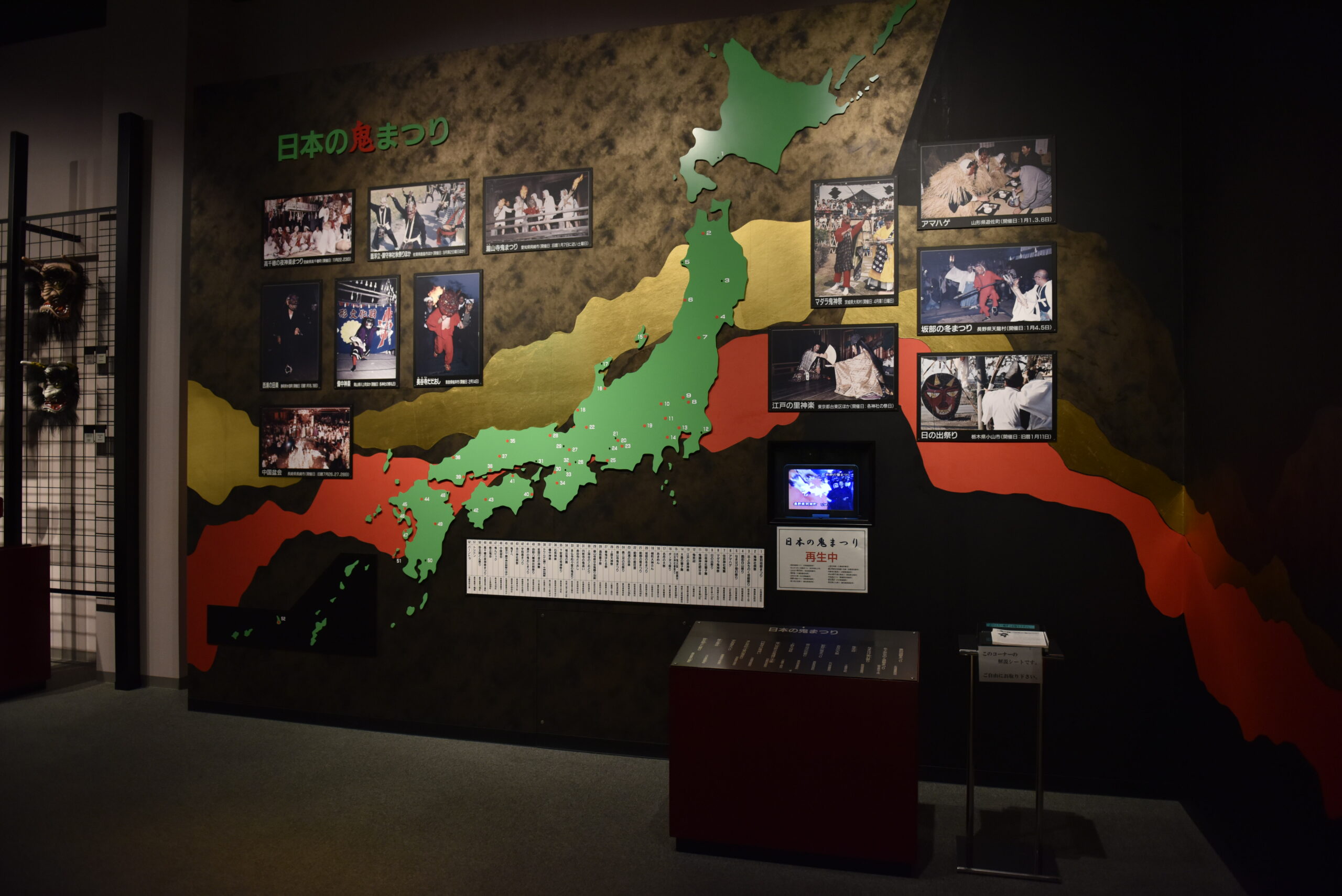 こちらのコーナーでは、地図とともに、日本全国の鬼が一覧で見られるようになっている。鬼ってこんなに種類あったの?と驚く方も多いだろう。アマハゲとナマハゲとか、似ているけど少し違うという鬼もある。北から南まで、日本の様々なところで鬼伝説が息づいており、民俗芸能や年中行事などの形で今に伝わっているのだ。