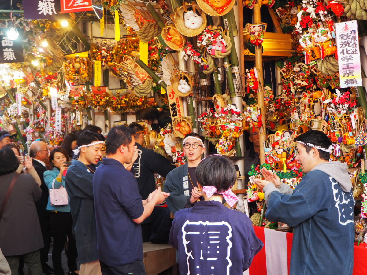 酉の市は、11月の酉の日に、鳥の名前に因んだ関東の寺社で開催されるお祭りです。飾られた熊手を売る出店や、祭りならではの食べ物を賑やかな雰囲気が特徴的です。