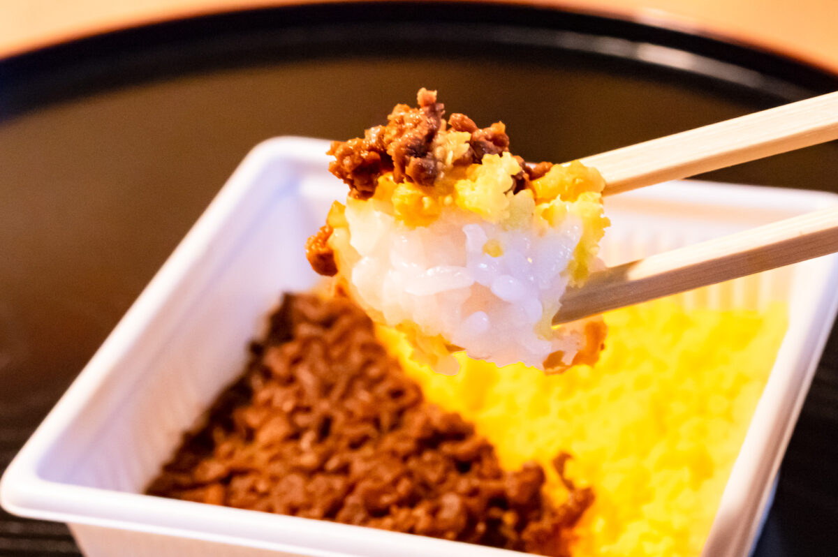 2段目は、そぼろ丼。「そぼろ」と「たまご」の2色に、「シシトウ」の緑色が色彩のアクセントとなっていてキレイですね。