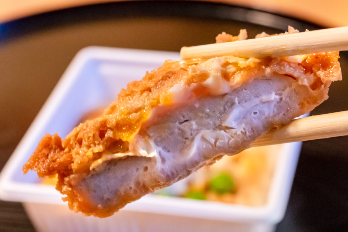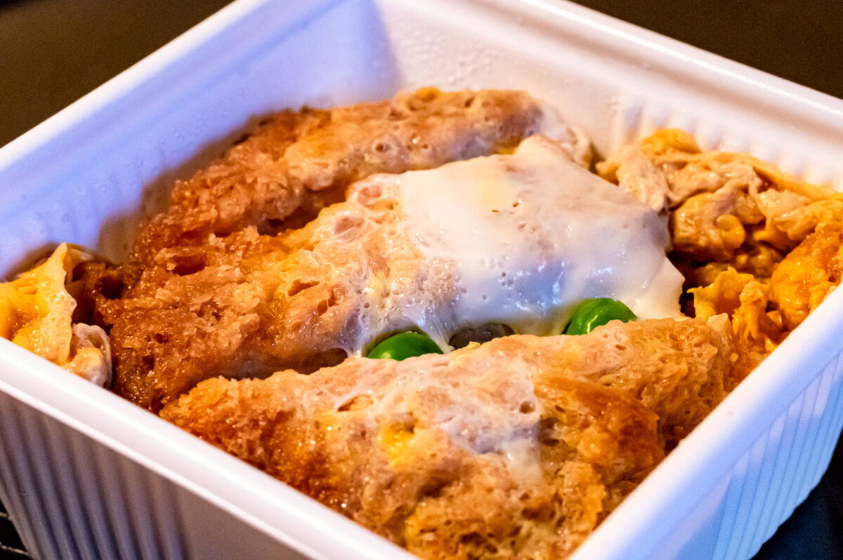さっそく一切れ頬張ると、ベタベタとした脂っぽさもなく、しっとりとした柔らかいヒレかつ。冷めていても美味しく頂けるよう、少し味は濃いめですが、出汁の風味豊かなタレを含んだたまごと、甘みのあるタマネギのコンビネーションは最高。いつの時代も左右されない心満ちる喜びを感じます。まるで、夢の超特急のように箸が止まりません。